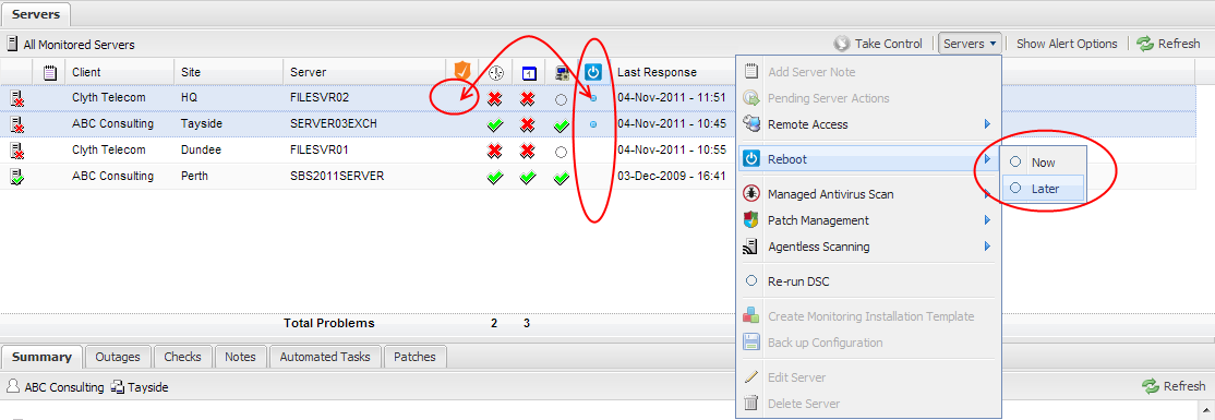 The second improvement -- is it? Could it be? Are you serious? Can we..?!!? YES, yes you can select multiple machines in your dashboard by using Shift+click and Ctrl+click. When you do so, the Server/Workstation menu will change to the 'multi-menu that you see above. Options that are applicable to multiple machines will be the only ones available. In the case of the Install Patches dialogue, all systems selected will have this command sent to them.